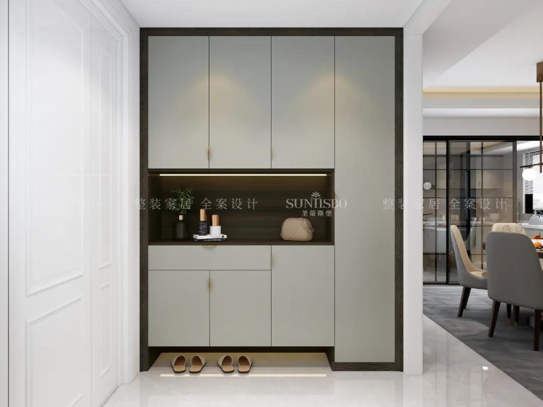 玄關吸納了極簡精華,采用極簡線條將入戶玄關模塊化分割,完成了一場精簡入戶的儀式感。煙熏色與淺灰色彩有序排列出一個個性的極簡入戶空間。