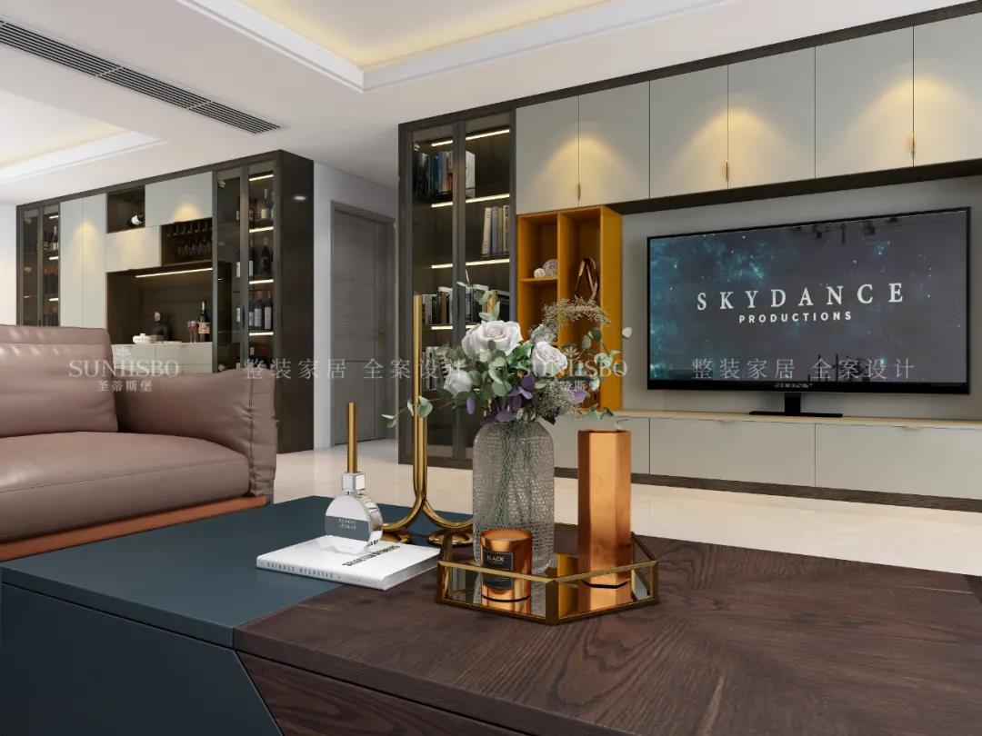 客廳一面置頂的定制柜,大大增加了空間收納,也將電視背景墻的觀賞性發揮到極致。淺灰與明亮橙的“動靜”屬性,與沙發上的愛馬仕橙相呼應,從空間中漫溢出歡樂和跳動的樂章,回響生活中那一抹絢麗和精致,同時也擁有著對立且和諧的高級范兒。