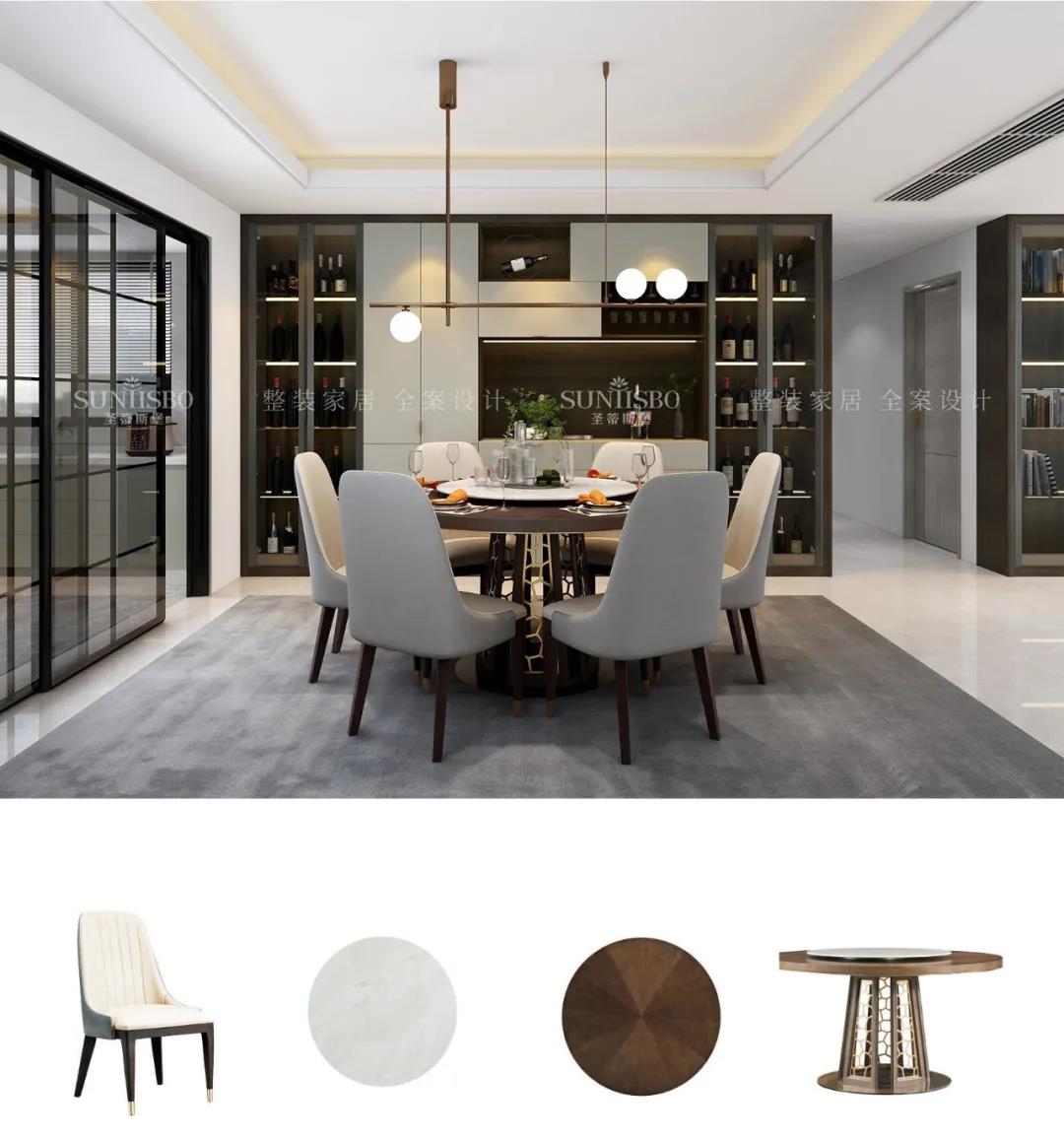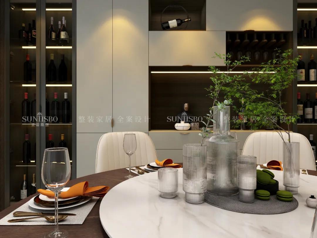 移步到餐廳空間,餐邊柜立面簡致,紋理細膩,展示區合理分配,增強了空間層次感,彰顯出飽滿的意式美感。實木柜面加以金屬拉手的裝飾,將極簡現代與高端質感融合,以簡約的形式表達出“簡而不失其華”的感染力。
