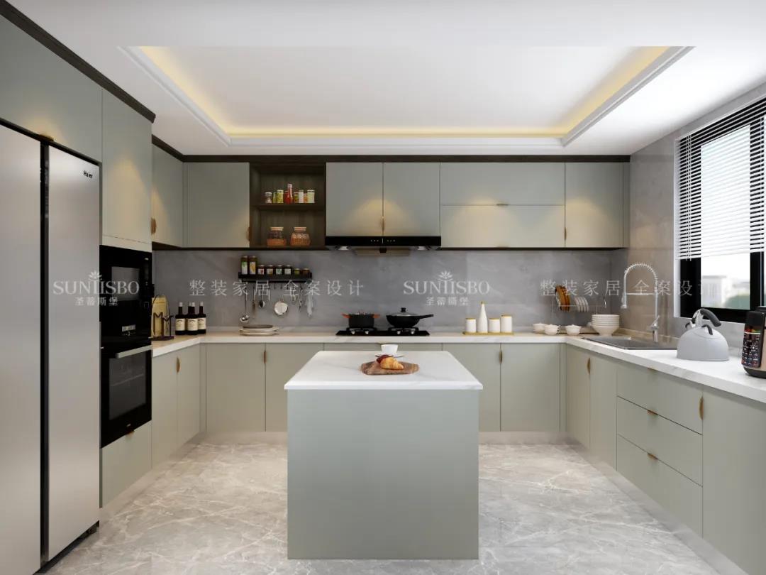 廚房的淺灰色調與明媚的自然光線重合,由空到滿,完成了一場空間與質感的展示。案臺上擺放的居家生活用品,充斥著溫馨的生活氣息。質感櫥柜線條秩序排列出廚房空間的簡約主題感。日光穿過百葉窗,將生活空間梳理的溫柔且愜意!