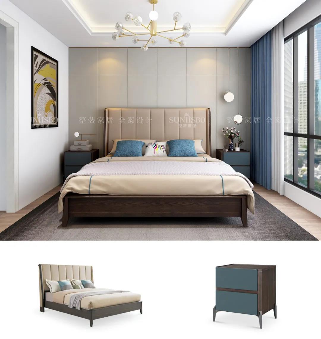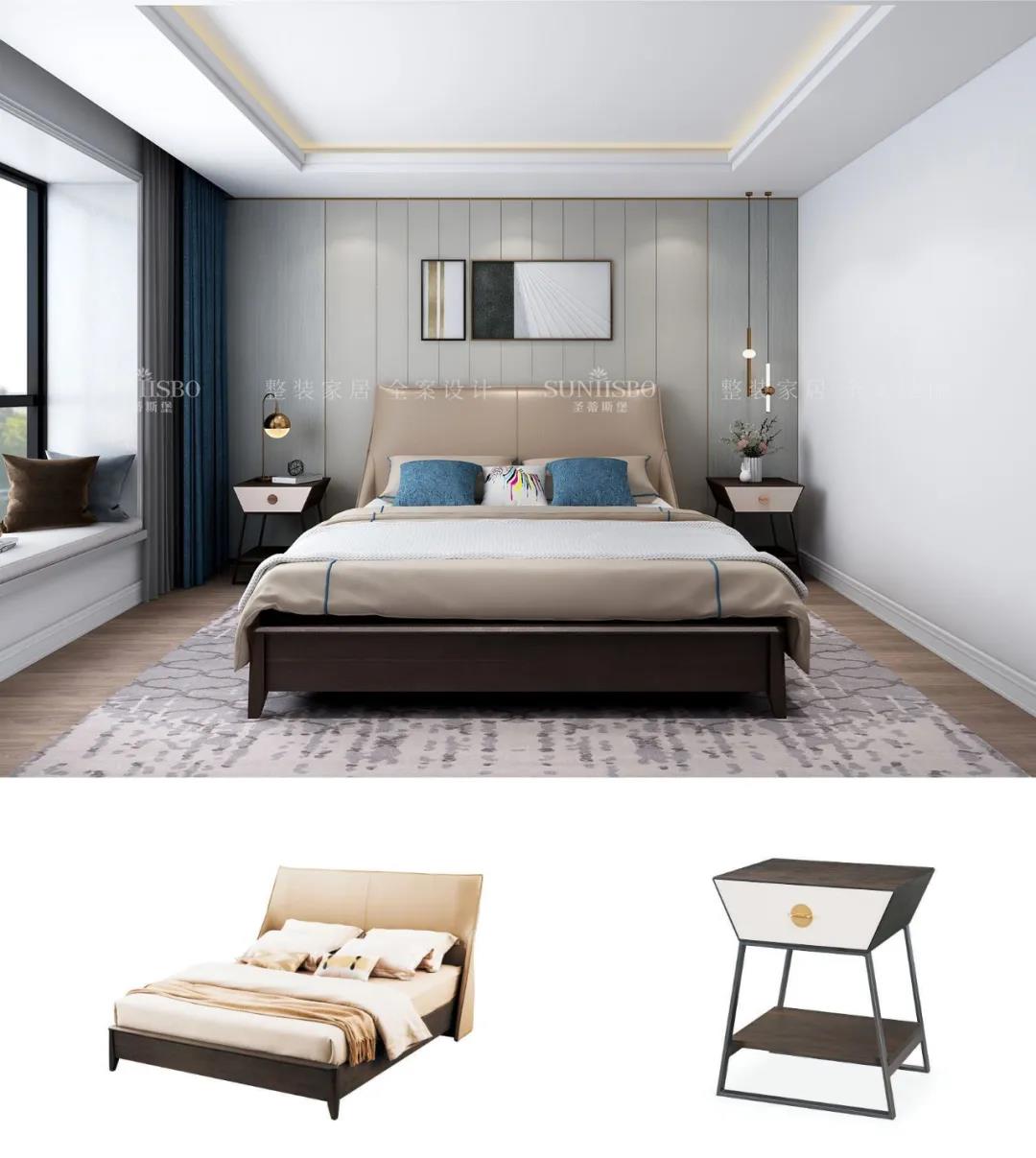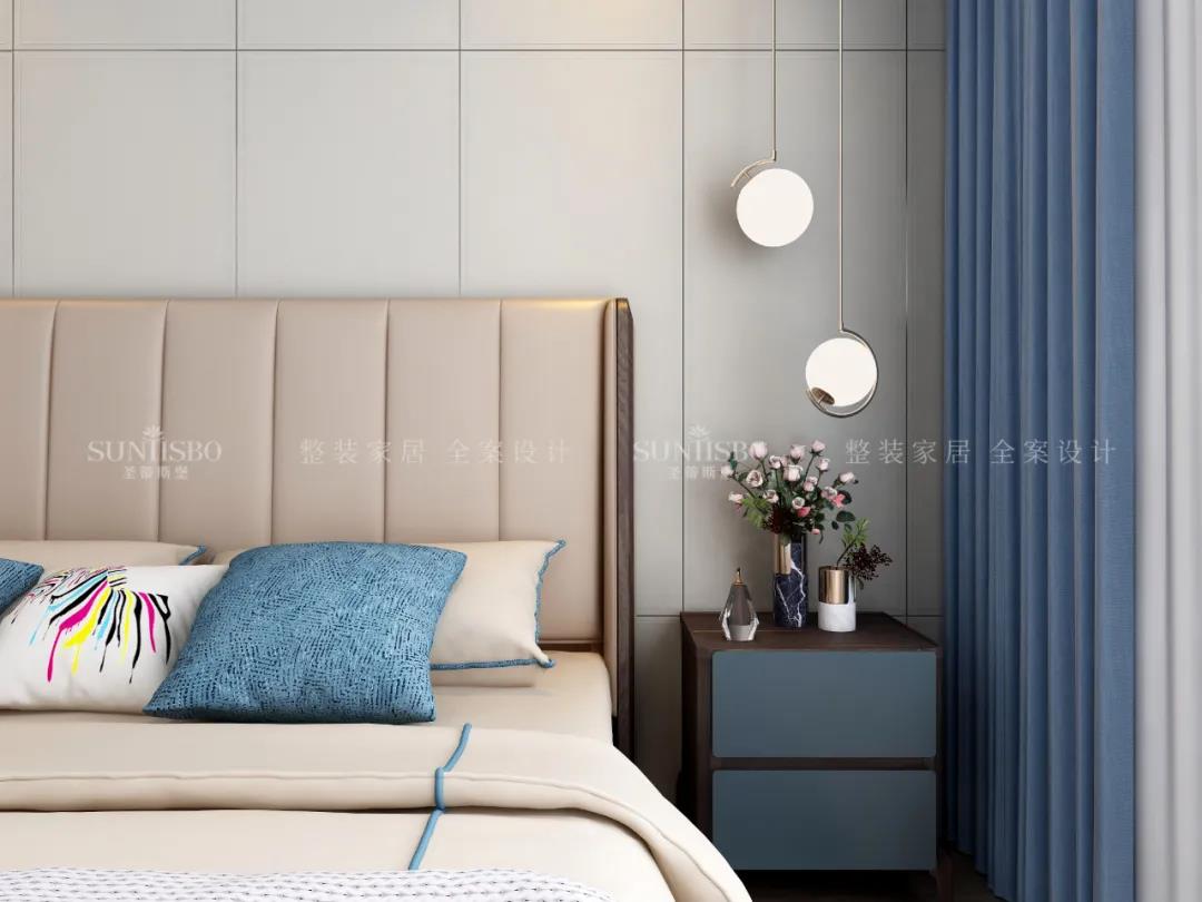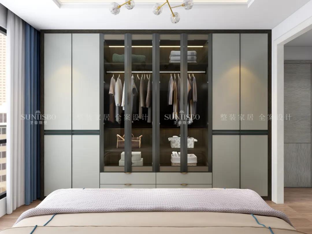 設計師運用最為百搭淺灰實木護墻板打造主臥空間,簡約的線條縱橫交錯,帶來了干凈、清爽、舒適的視覺效果。明暗分區的衣柜在燈光的渲染下,虛實光影變換其中,為每個角落氤氳出浪漫的氣息。