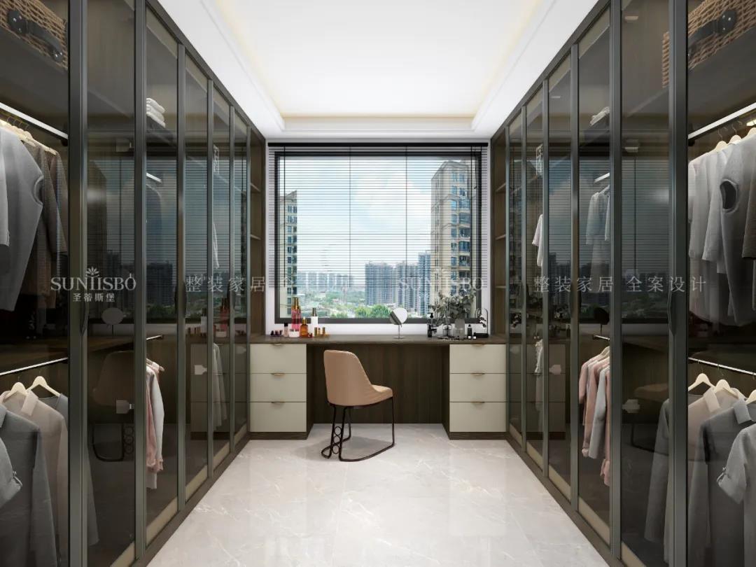 家的質感,并不是用瑣碎的東西堆砌而成的,衣帽間是品質生活的一個重要的指標。這套衣帽間是以平行的格局設計成步入式空間,全開放式的呈現,金屬與透明玻璃材質的糅合,襯托出柜體高級奢華的質感。