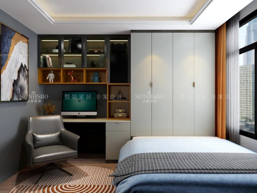 兒童房視覺上以簡潔為主,書桌衣柜床一體式極簡設計,讓空間更輕便舒適。舒緩的色調與活躍的跳色合理搭配,營造出一個充滿無限幻想的童話王國。