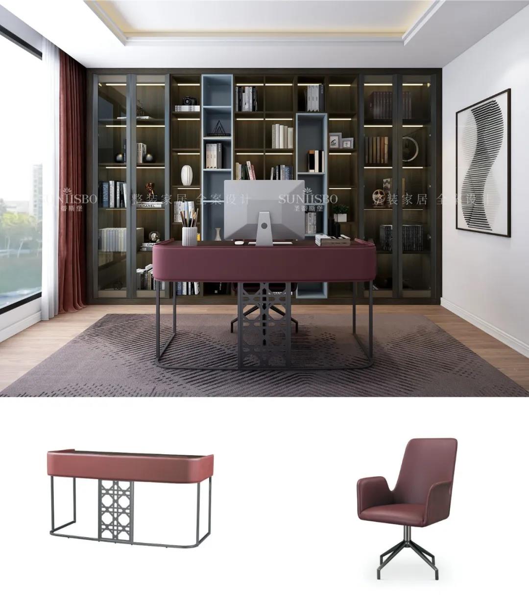 書房用定制柜解決了一面墻的設計,沒有夸張的色彩裝飾,簡潔的柜體與墻面搭配起來顯得十分精致整潔,透明的可視區域從視覺上擴大了空間感。閑暇時光,拾一本書,于書房,將生活與工作區分開來。