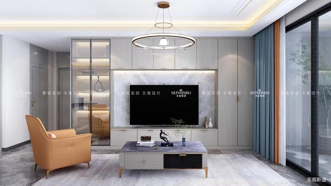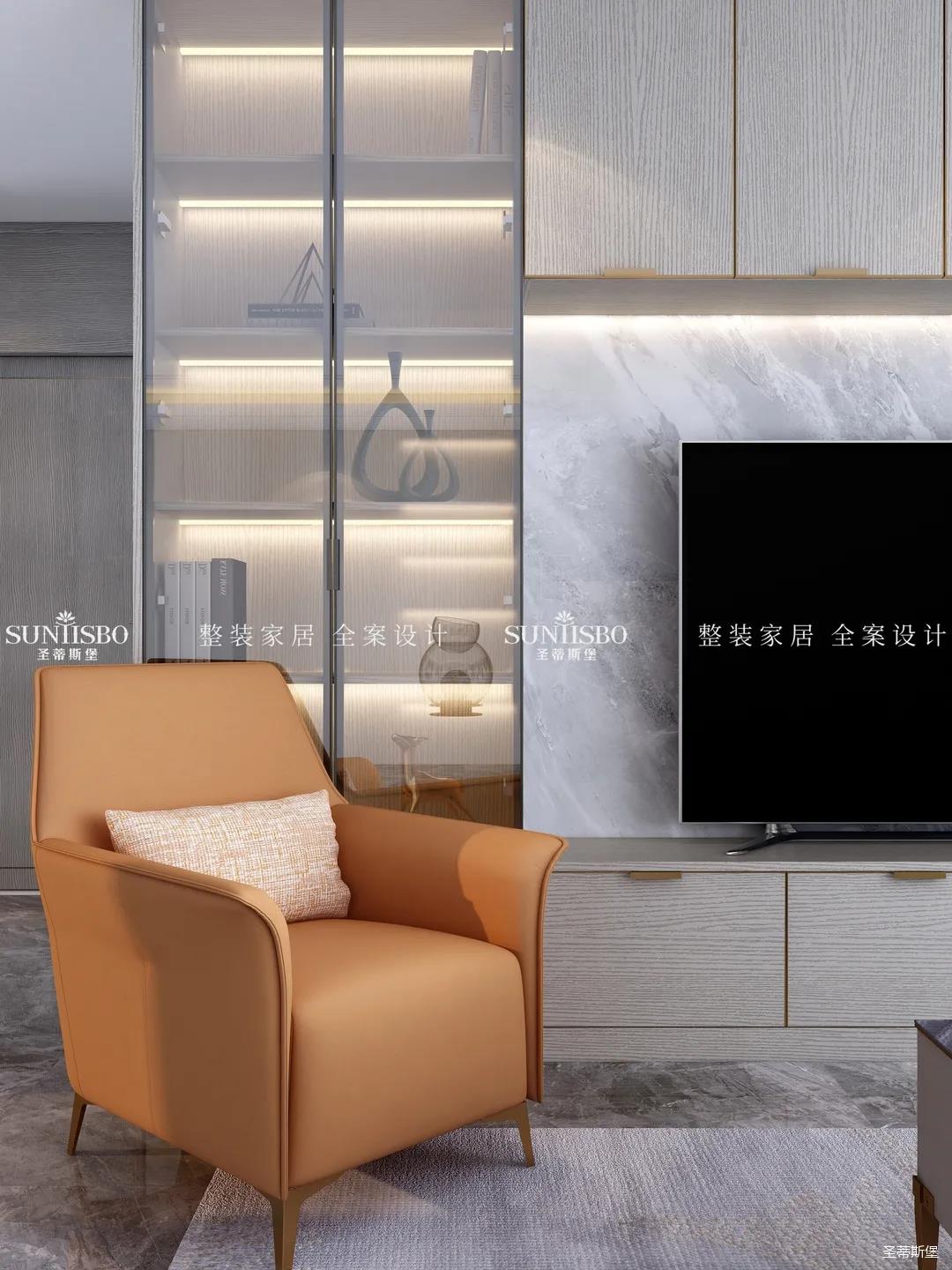 高級灰+活力橙,是百看不厭的經典搭配,當冷靜與熱情碰撞,為客廳奠定了時尚優(yōu)雅的基調。設計師以定制柜為原型,打造出兼具實用與裝飾功能為一體的電視背景墻,金屬包邊的柜體,在幾何燈光的照耀下散發(fā)出光澤,提升了整體空間的質感,也撩動著我們的心弦。