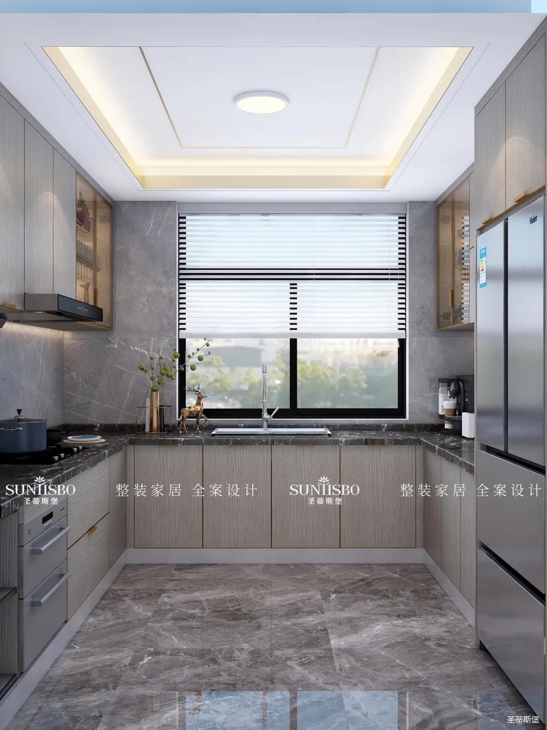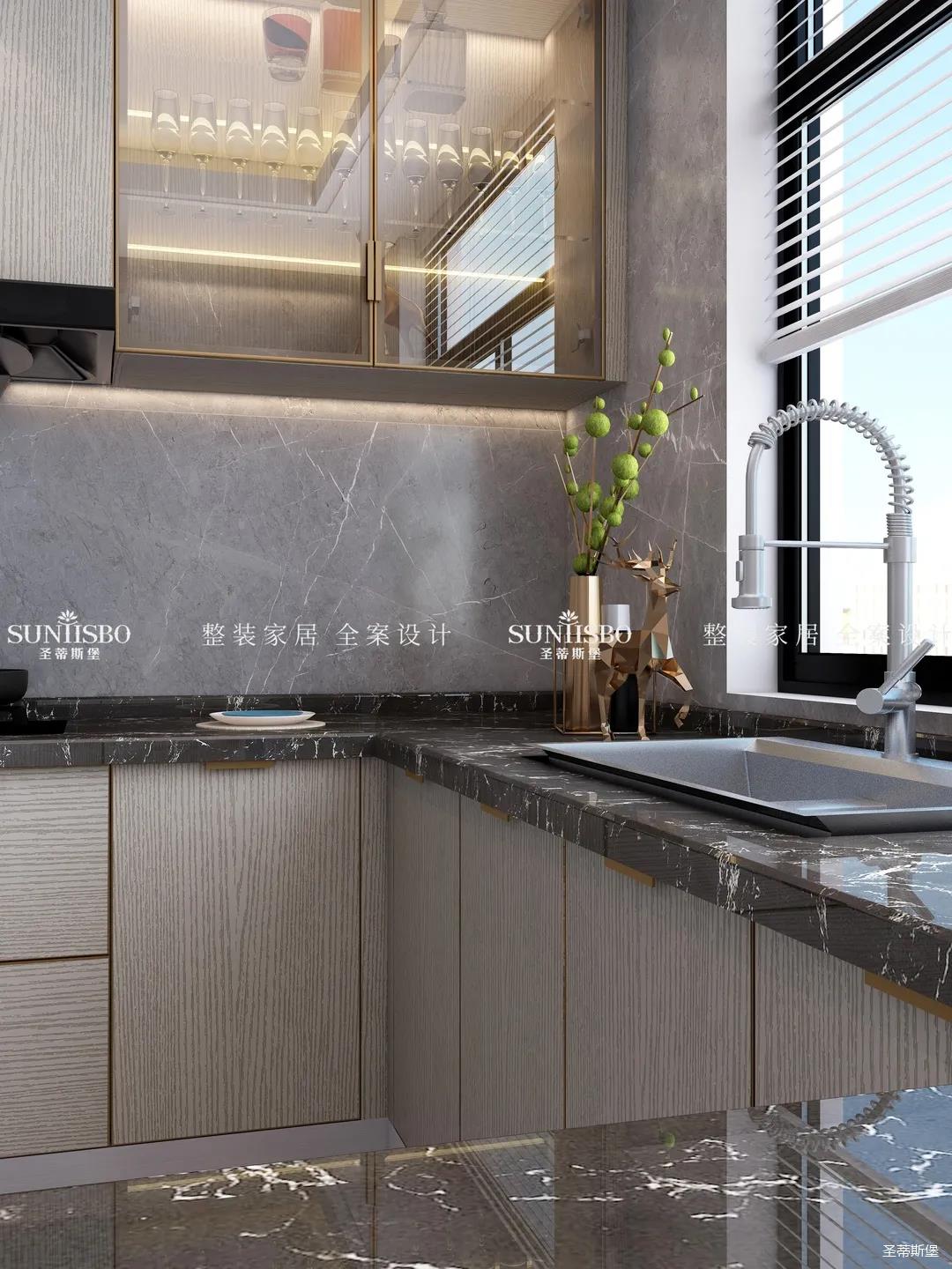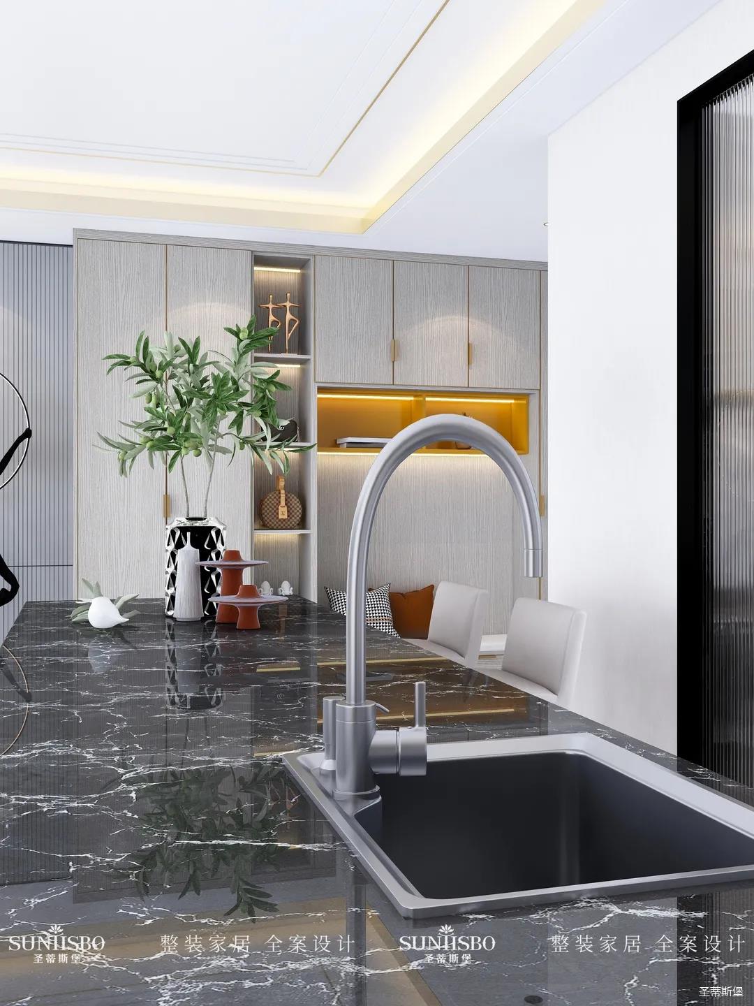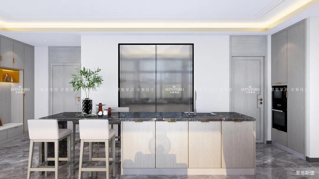 設計師以廚房&西廚區(qū)為布局的中軸,打開左右空間,延伸出廚房動線功能區(qū),增加西廚區(qū)域,有效延伸空間。設計師打造了下午茶專屬的中島臺,中島臺與客廳串連,方便屋主隨時分享美食樂趣。