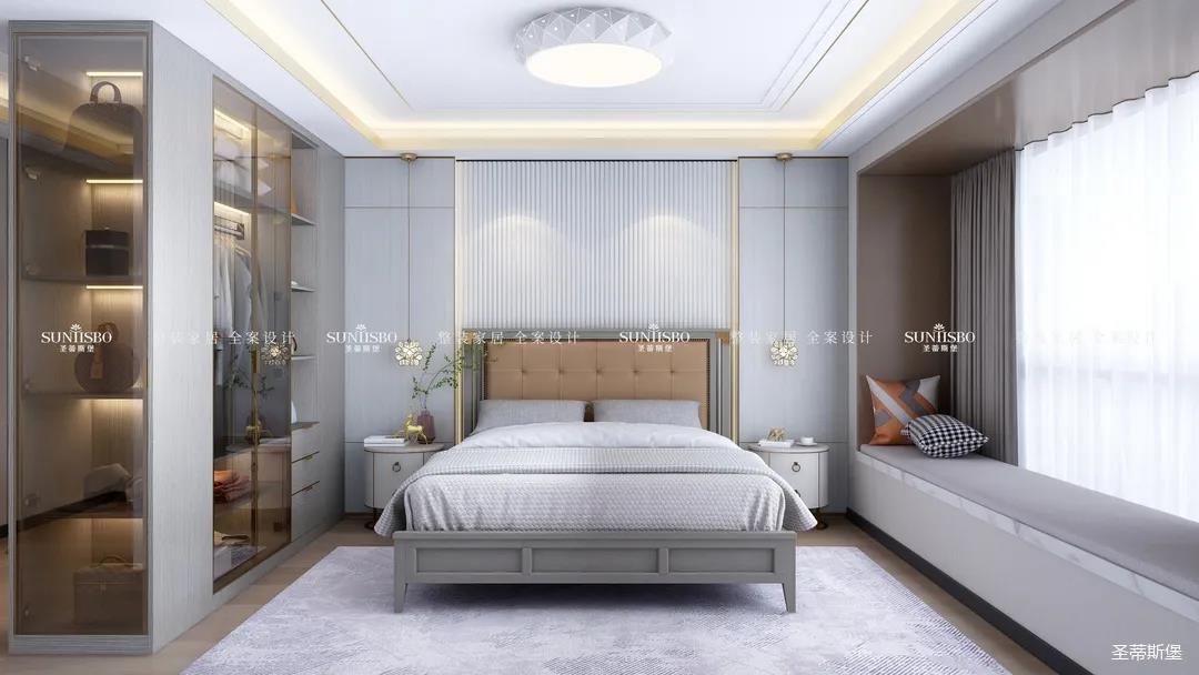精于思而展于型,主臥將浮華的裝飾剔除,裝飾線連接各個區(qū)域,強調了空間的節(jié)奏與韻律。運用時尚灰大面積展現(xiàn)著高級感,讓不同色彩的家具結合,營造出與眾不同的韻感與雅致,給人良好的睡眠體驗。