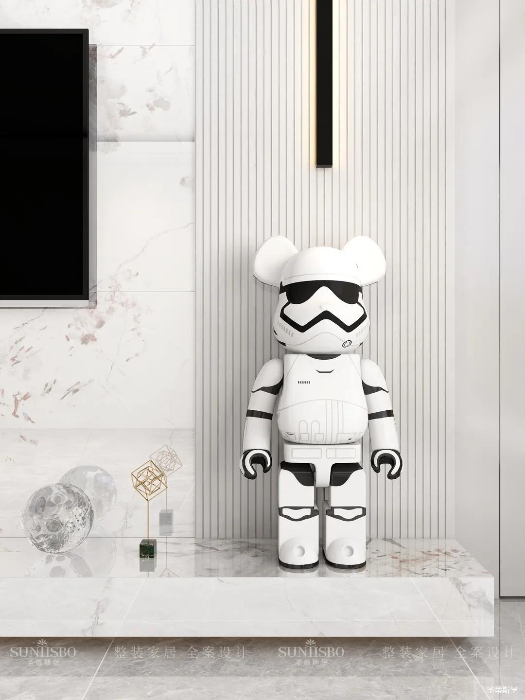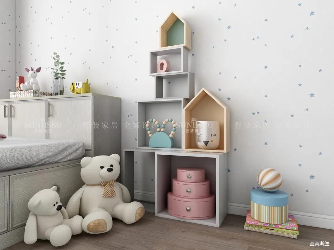 兒童房摒棄了傳統榻榻米的呆板與嚴肅,延續主臥輕奢雅致的空間氛圍,以木質為主材質,利用面板的線條帶來視覺上的延伸,將童趣與理性相融表現兒童應有的學習氛圍與生活習慣。開放式展示區應用藍色點綴,再次強化了空間專屬兒童的活躍格調,也呈現了設計師在材質與色彩運用上的精細與專業。
