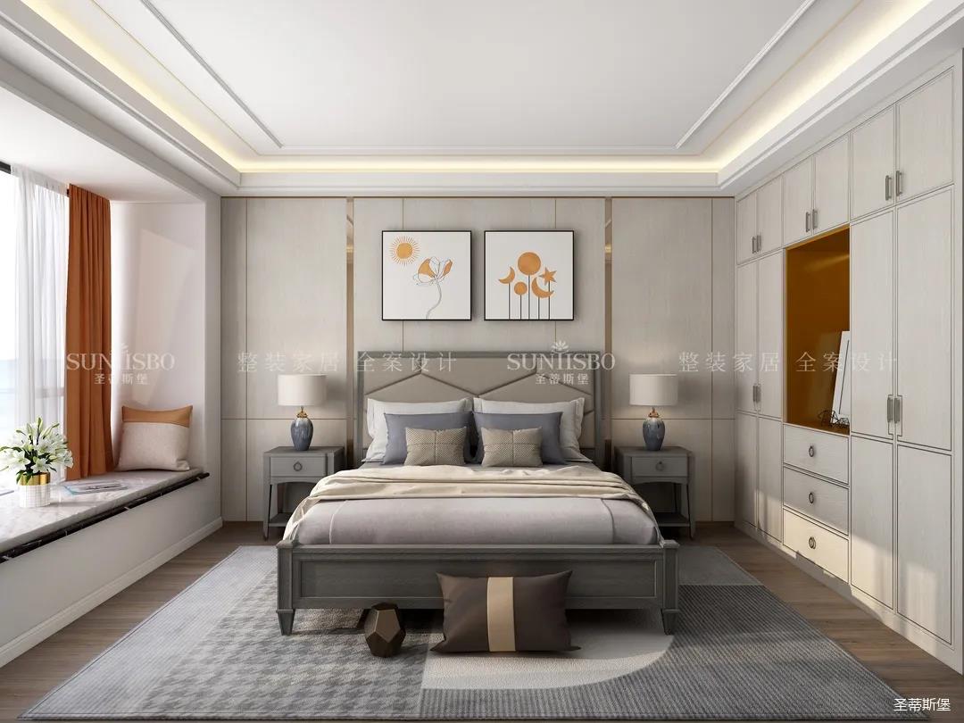 主臥隨著優雅的金屬線條鋪開,臥室內的靜謐感有序的傳遞著,帶有溫度的木飾面與溫潤的實木地板在同一空間交匯,充滿輕奢質感。明亮橙的色彩點綴讓空間活躍的格調不斷擴充,仿古白的定制柜體在空間形成若隱若現的視覺平衡,將溫暖,柔和組合成日常的睡眠氛圍。